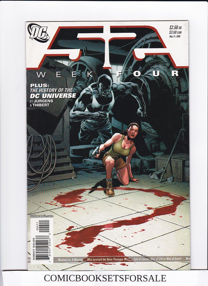 Written by Geoff Johns, Grant Morrison, Greg Rucka, Mark Waid. Breakdowns by Keith Giffen. Art by Joe Bennett, Ruy Jose and Jack Jadson. Backup feature by Dan Jurgens & Art Thibert. Covers by J.G. Jones. After the INFINITE CRISIS and before One Year Later, the DCU spent a year without Superman, Batman and Wonder Woman. A year in which those heroes were needed more than ever as the fate of the world hung in the balance. Who stood up in their absence? And who sat out? The story of DC’s most eventful year ever can now be told as four of the hottest writers in comics – Grant Morrison, Geoff Johns, Greg Rucka, Mark Waid – deliver an unprecedented weekly tale of death, danger, romance, intergalactic terror and the never-ending, universal meaning of heroism. Joined by storyteller Keith Giffen and cover artist J.G. Jones, 52 features art for the first month by Joe Bennett, Ruy Jose, and Jack Jadson. Also, starting in Week #2: ‘The History of the DC Universe,’ a 10-part backup feature by Dan Jurgens and Art Thibert that takes you on a tour through the legendary past of the DCU. 52: A year without Superman; a year without Batman; a year without Wonder Woman…but not a year without heroes.