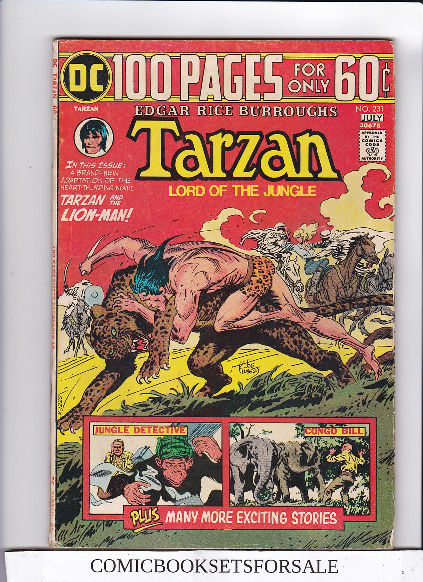 96-page giant. New stories: “Tarzan and the Lion Man” (part 1) (script and art by Joe Kubert); Korak in “The Ancient Awakes!” (script by Bob Kanigher, art by Alex Nino). Reprints: Congo Bill in “Safaris For Sale,” Tarzan in “The Deadly Dangers of Pal-Ul-Don” (art by Russ Manning), Simba the Jungle Boy in “My Enemy, the Jungle” (script by George Kashdan, art by Jack Sparling), and “The Return of Detective Chimp” (script by John Broome, pencils by Carmine Infantino, inks by Frank Giacoia). One-page article, “Evolution Through an Ape-Man’s Eyes” by Allan Asherman. Kubert cover.