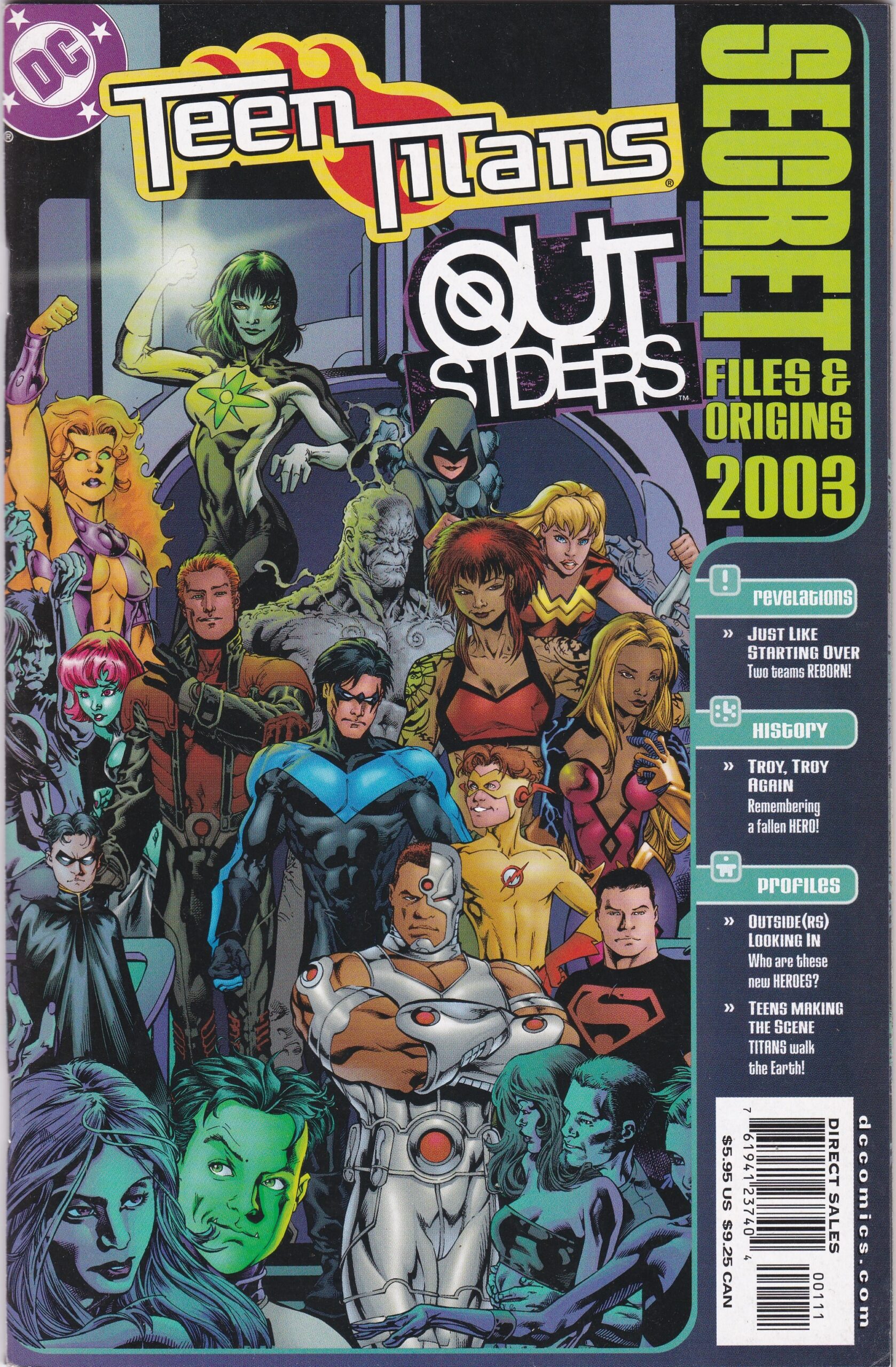 WRITTEN BY GEOFF JOHNS, JUDD WINICK, PHIL JIMENEZ, AND VARIOUS; ART BY IVAN REIS, CARLO BARBERI, JIMENEZ, AND VARIOUS; COVER BY TOM RANEY, MIKE MCKONE, SCOTT HANNA & LARY STUCKER. An explosive one-shot devoted to DC’s hot new super-teams! TEEN TITANS writer Geoff Johns and OUTSIDERS writer Judd Winick join Ivan Reis, Carlo Barberi, Marc Campos & Norm Rapmund for the extra-sized story “A Day After,” revealing secrets of both groups, with hints at the terrible threats they’ll face in the months to come! Plus, Donna Troy’s friends and loved ones remember their fallen friend in the 8-page “Who Was Donna Troy?”, a story written and pencilled by Phil Jimenez and inked by Andy Lanning, and pin-ups of familiar and new characters from both teams’ titles by an array of incredible artists. And don’t miss the pencilling debut of Geoff Johns! Profile pages (mostly written by Johns & Winick): Robin by Rick Mays & Aaron Sowd, Nightwing, Jade & Arsenal (2 pages) by Mike McKone & Lary Stucker, Indigo by Ale Garza & Stucker, Wonder Girl by Will Conrad & Nelson, Thunder by Jason Pearson, Cyborg by Karl Kerschl, Starfire by Michael Turner, Kid Flash by Geoff Johns & Nelson (with text by Jeremy Johns), Grace by Judd Winick (with text by Mike McAvennie), Metamorpho by Tom Raney & Scott Hanna, Beast Boy by Carlo Barberi & Marlo Alquiza, Deathstroke the Terminator by Kilian Plunkett, Superboy by Jim Mahfood, Raven by Pascual Ferry.