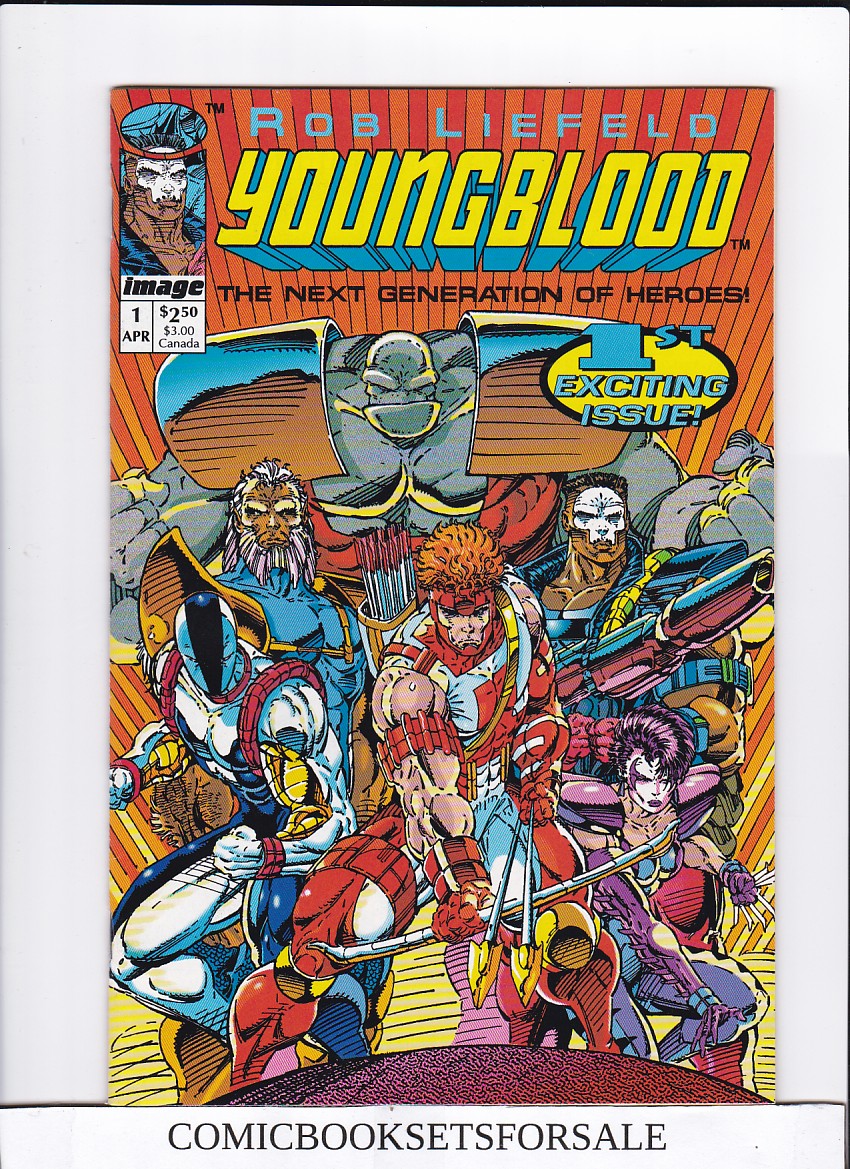 Story by Rob Liefeld and Hank Kanalz. Art by Rob Liefeld. Introducing the next generation of super-heroes…meet Youngblood. This explosive first issue features two teams and two exciting adventures. First Shaft, Die Hard, Bedrock, Vogue, and Chapel must confront the nefarious Four. Then, Sentinel leads Riptide, Brahma, Photon, Psi-Fire, and Cougar into a Middle-Eastern country to put an end to an evil dictator’s rule. Brought to you by the co-creator of Cable from the New Mutants and X-Force. 32 pages.